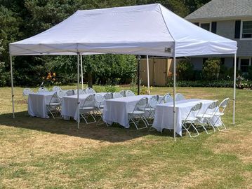 Our 10x20 popup tent offers a convenient and portable shelter solution for any event. Perfect for small gatherings, vendor booths, or outdoor parties, this tent provides reliable protection from the sun and light rain.